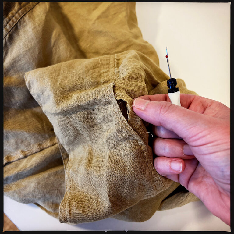 Um Wartezeiten zu überbrücken, habe ich mir eine Leinenbluse mitgebracht, die nur so halbwegs passt und trenne schonmal einen Ärmel ab. Sehr mühseelig… Die Zeit geht schnell vorbei. Zum Nähen bin ich leider nicht gekommen aber ein Etappenziel auf dem Weg zum passenden Oberteil ist erreicht. Das Grundteil scheint zu passen. Nächstes Mal kümmern wir uns um Bündchen und die Kragensituation.