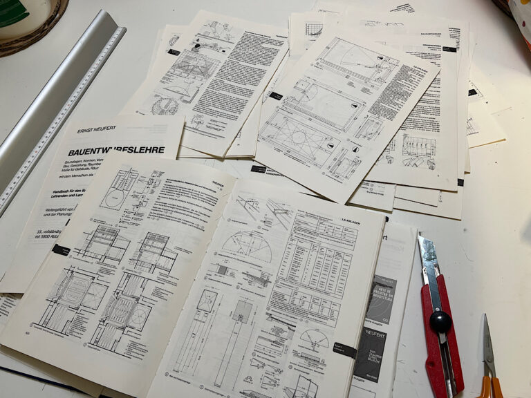 Wenn ich einen Stapel/Haufen/Schublade/Kiste/Buch durchschaue, packe ich ein paar Teilchen für mich zur Seite und verteile die Sachen, die ich mir gut für Büchermachen, Collagen etc. vorstellen kann, auf 10 Stapel für die Kreativkisten. In dem Architekturbuch, welches ich am 12 August im Tauschregal gefunden hatte, sind ganz interessante Abbildungen und das Papier ist gut geeignet für Art Journals oder Ideenbücher. Kommt in die Kisten.