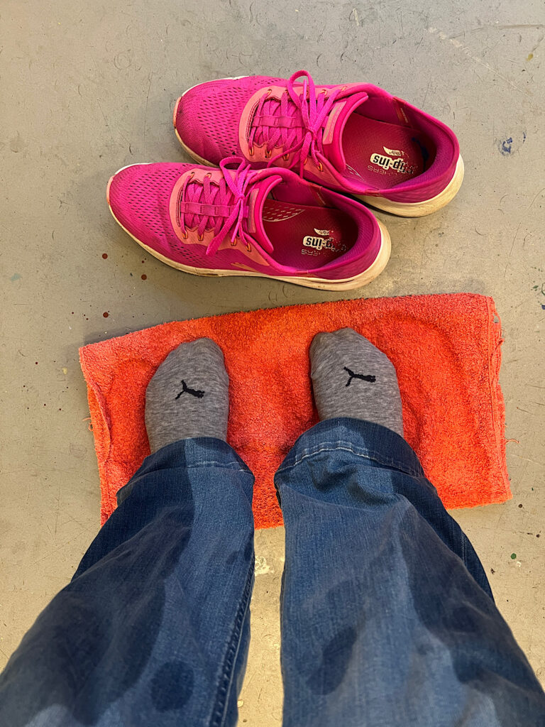 Das hatte ich total verdrängt über den Sommer. Wenn du eine Gummihose anhast, solltest du auch Schuhüberzieher anhaben. Die Suppe läuft nämlich direkt runter in die Schuhe… Anfängerfehler.