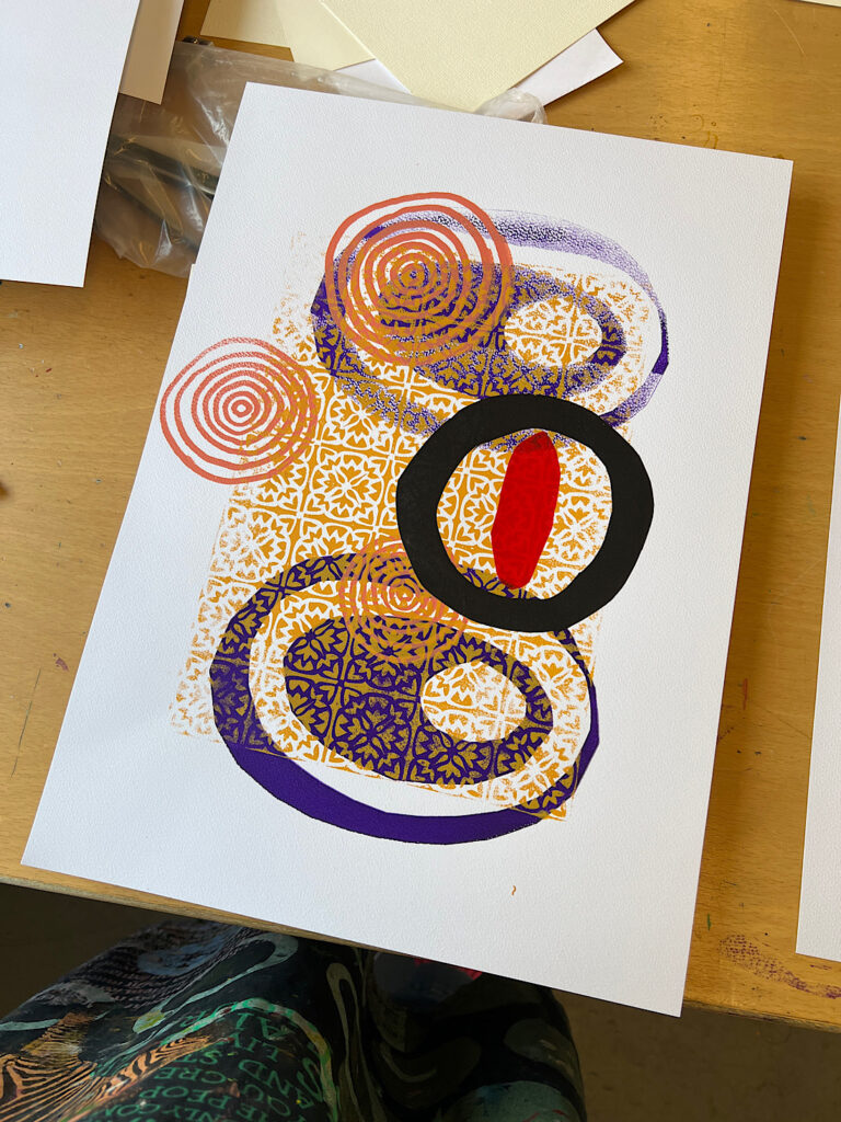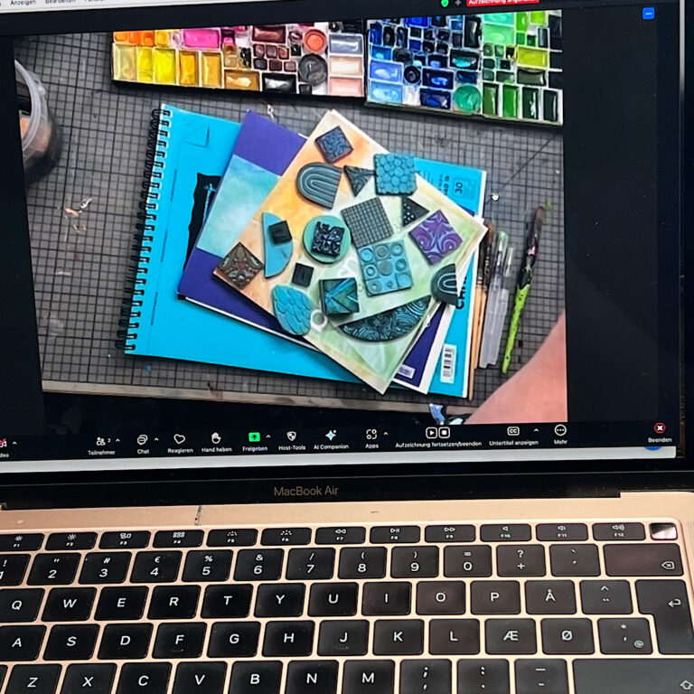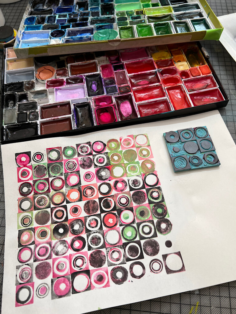 …und Stempelexperimente mit Wasserfarben und selbstgeschnitzen Stempeln. Mir ist während der Workshops wieder aufgefallen, wie wertvoll das Co-Künstlern doch ist. Auch wenn wir nicht direkt nebeneinander an einem großen Tisch gesessen haben. Besonders der Austausch von Tipps und Tricks, Materialempfehlungen, was Papier, Stempelkissen und andere Materialien angeht, war intensiv und lehrreich! Das macht es auch für diejenigen interessant, die sich die Aufzeichnungen der Workshops anschauen und dazu arbeiten. Ich werde mir auf jeden Fall ein paar Dinge besorgen, die ich noch nicht kannte… Danke an alle meine Atelierhauskünstlerinnen, die so großzügig ihr Wissen teilen!