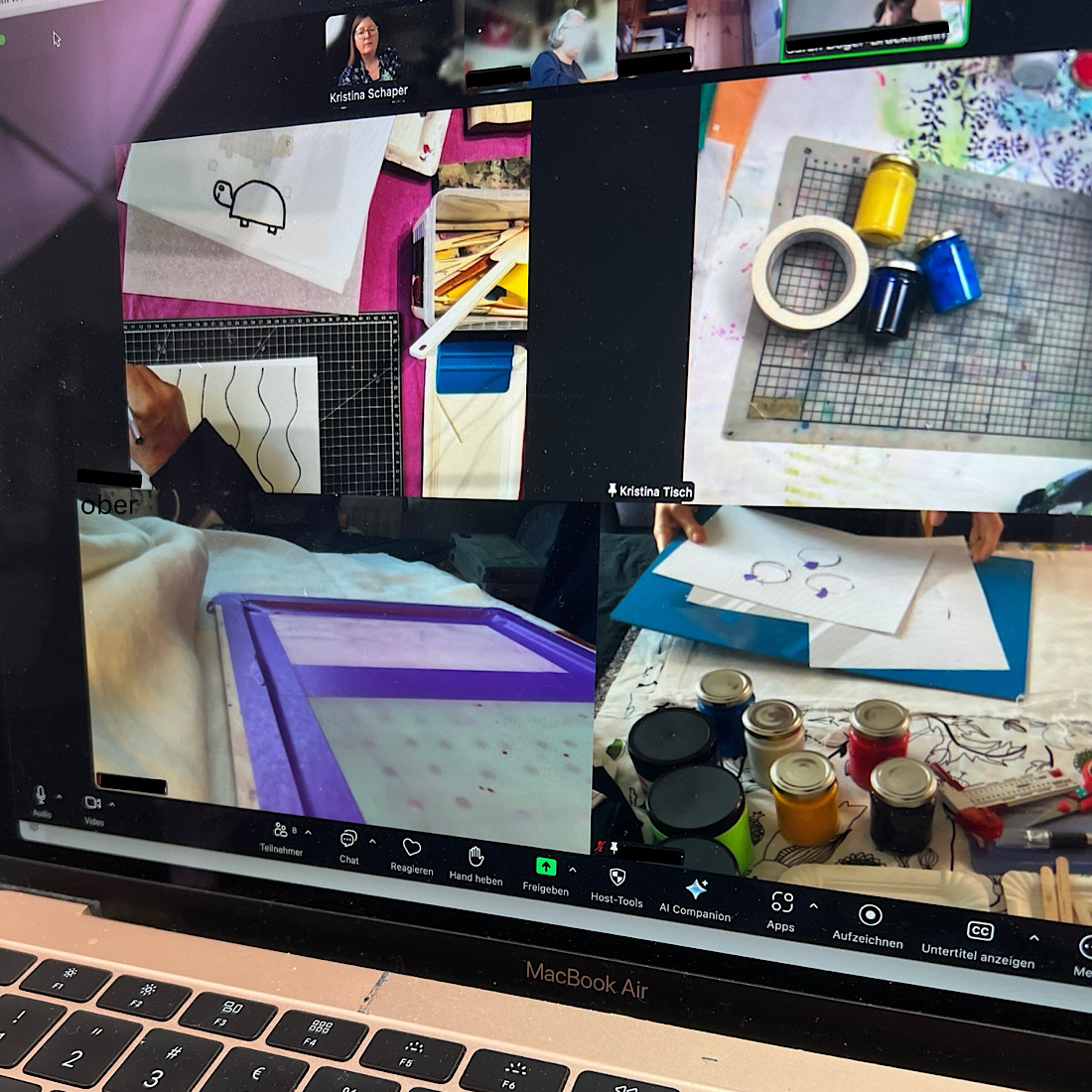 Und noch einen Workshop-Tag gab es im Oktober. Einfach Siebdruck – Zuhause Siebdruck lernen stand auf dem Programm und ich habe einen vergnüglichen Tag mit einer kleinen Gruppe von Siebdruck Anfängerinnen verbracht. Wir arbeiten dabei mit 2 Kameras pro Teilnehmer. Auf diese Weise kann ich gut auf die einzelnen Arbeitstische schauen.