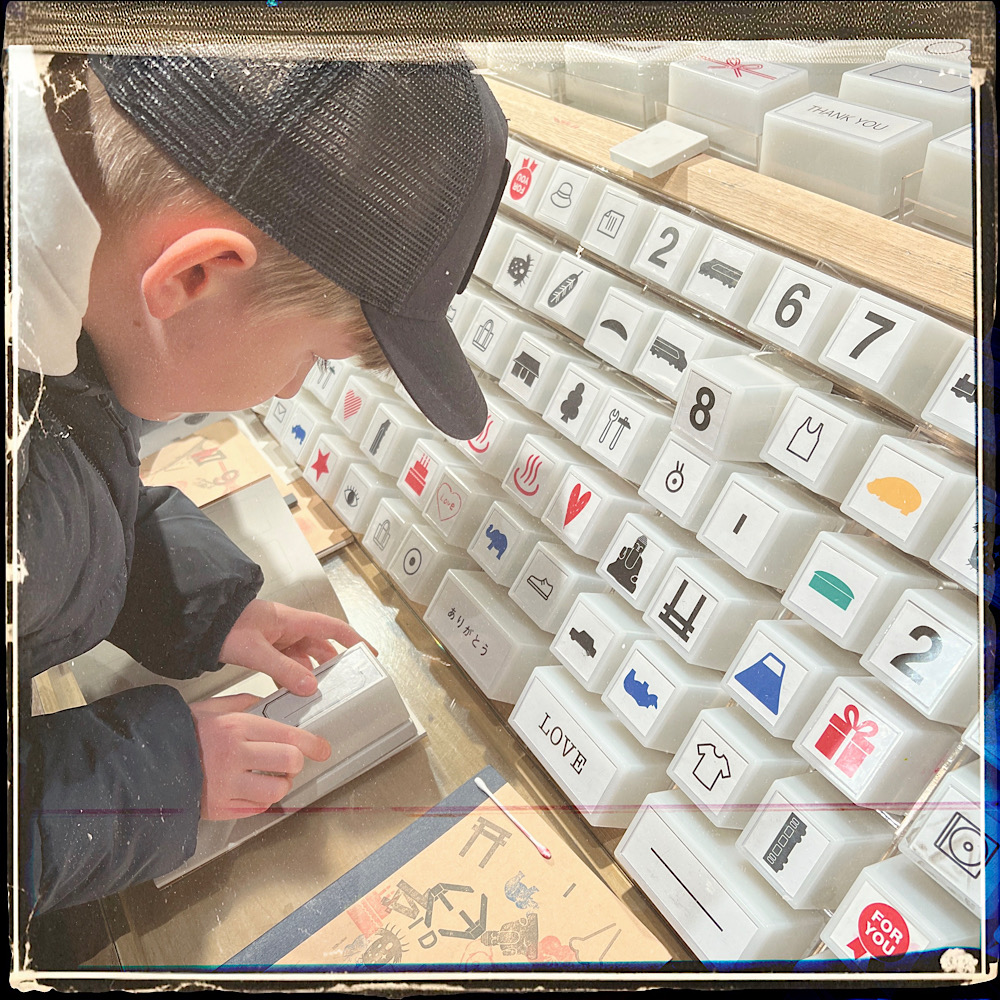 Ich hatte mir zwei Notizhefte gekauft und versorge mich noch mit einem Vorrat an Etiketten. Sehr praktisch das! Oskar stempelt mir ein paar Seiten voll. Die schneide ich dann später aus und klebe sie in meine Journals. An der Stempelbar darf man sich seine gekauften Schreibwaren noch bestempeln. Voll gut!